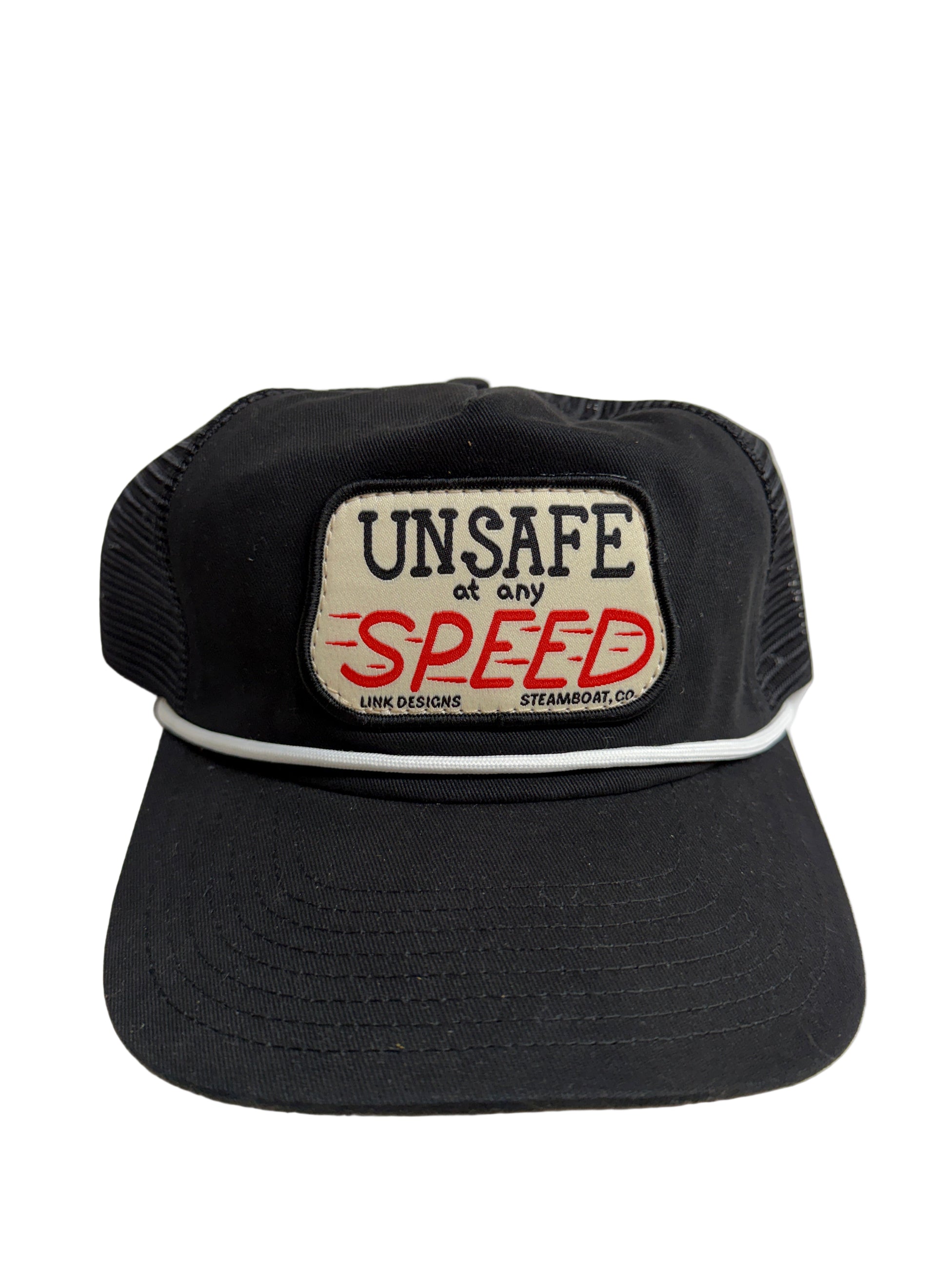 Original artwork “Unsafe at any Speed” patch sewn onto an unstructured SnapBack hat, black