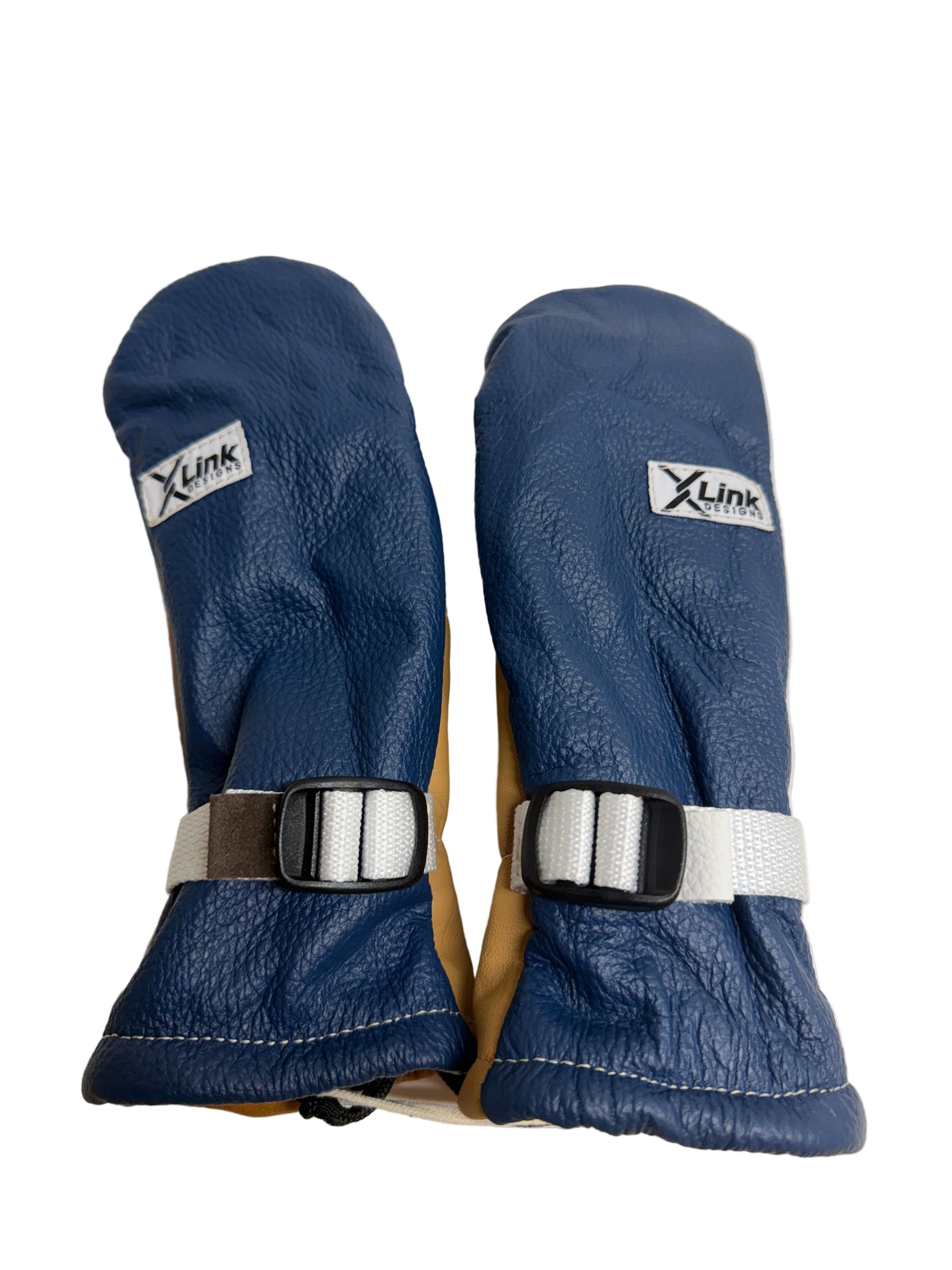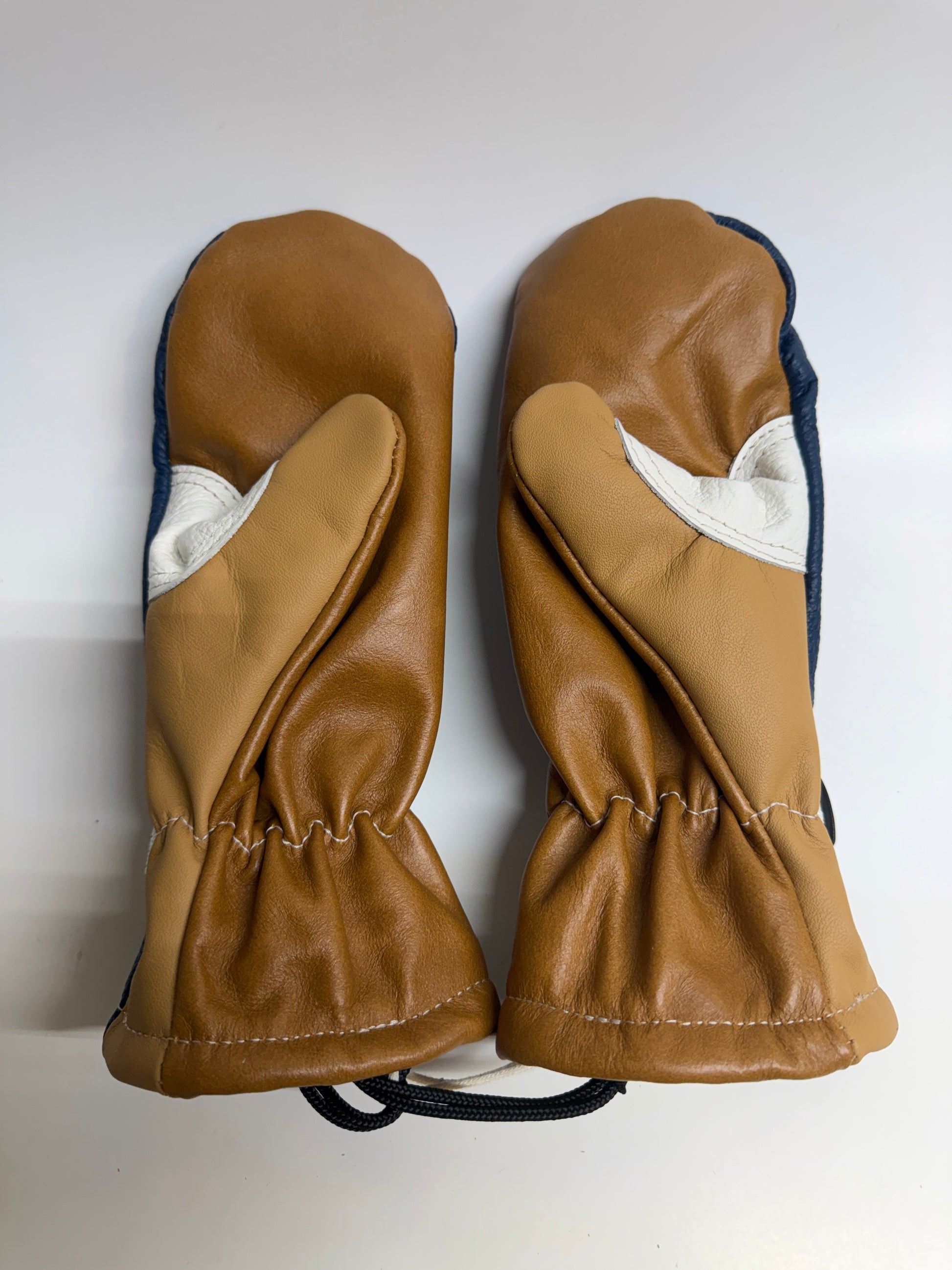 Mittens Made from upholstery leather scrap fabric. Various tan colors mixed with a blue top and white thumb insert highlight. Extra durable, fleece lined to keep you warm and one of a kind! Size M
