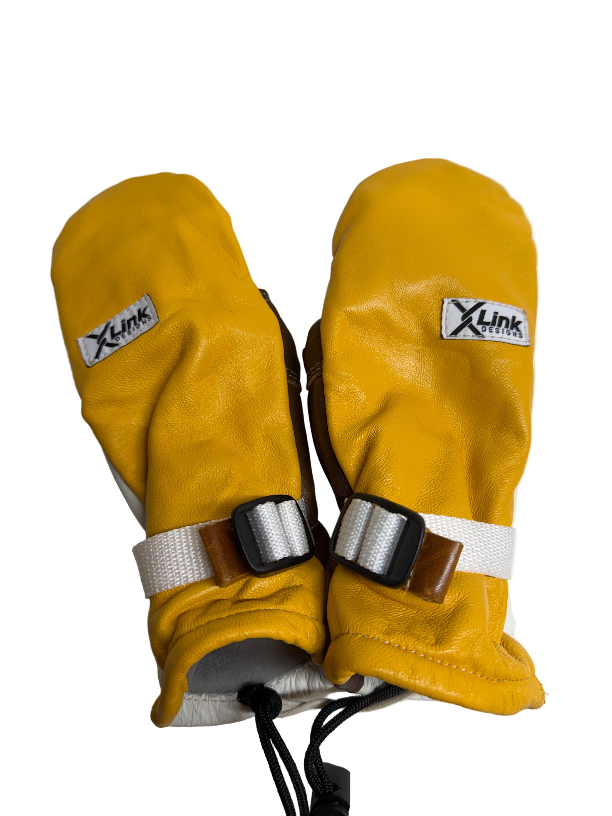 Mittens Made from upholstery leather scrap fabric. White palm, yellow top and brown thumb. Extra durable, fleece lined to keep you warm and one of a kind! Size M