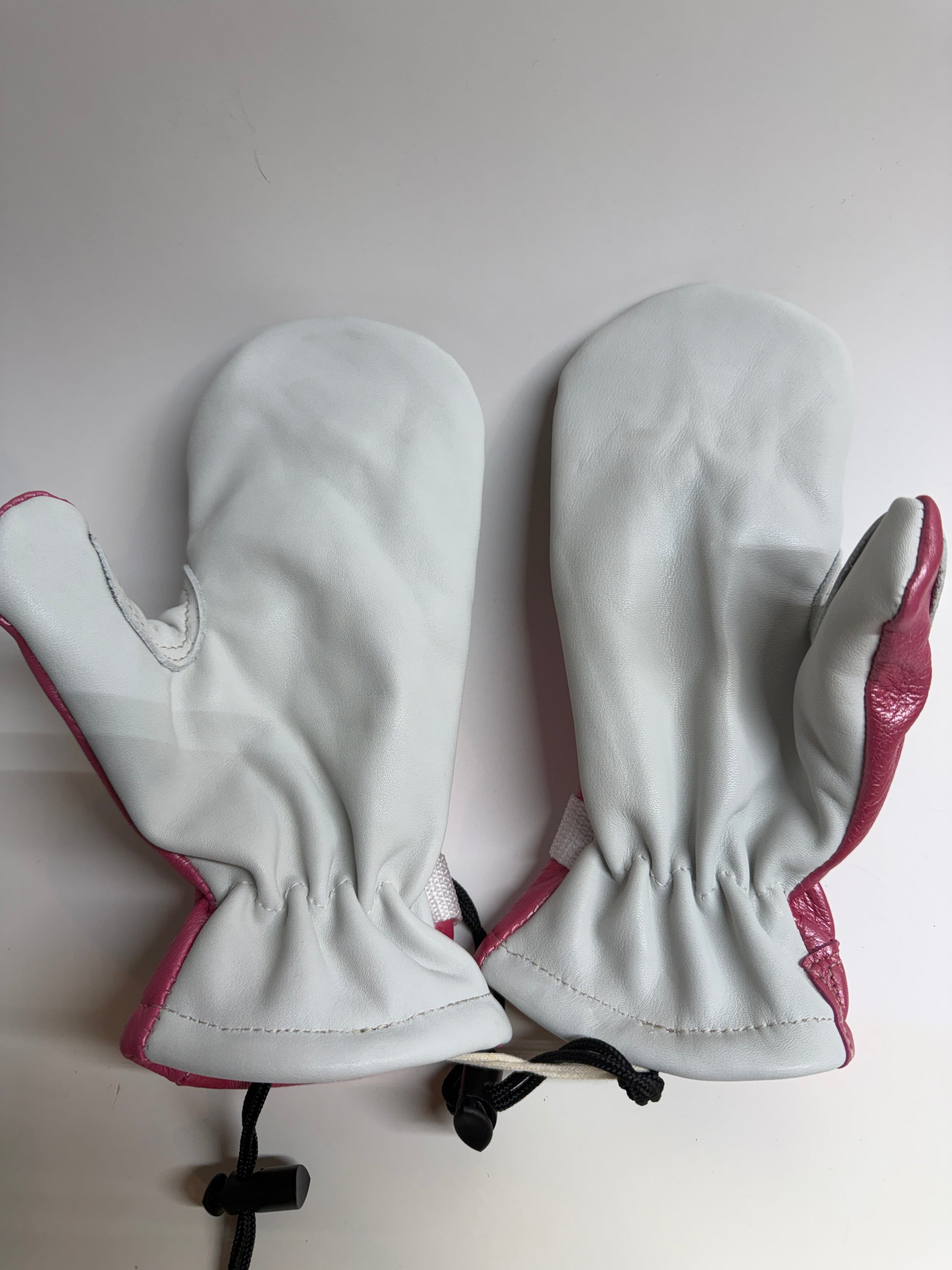 Mittens Made from upholstery leather scrap fabric. Metallic pink with a brown cap on the top and a white leather palm. Extra durable, fleece lined to keep you warm and one of a kind! Size S