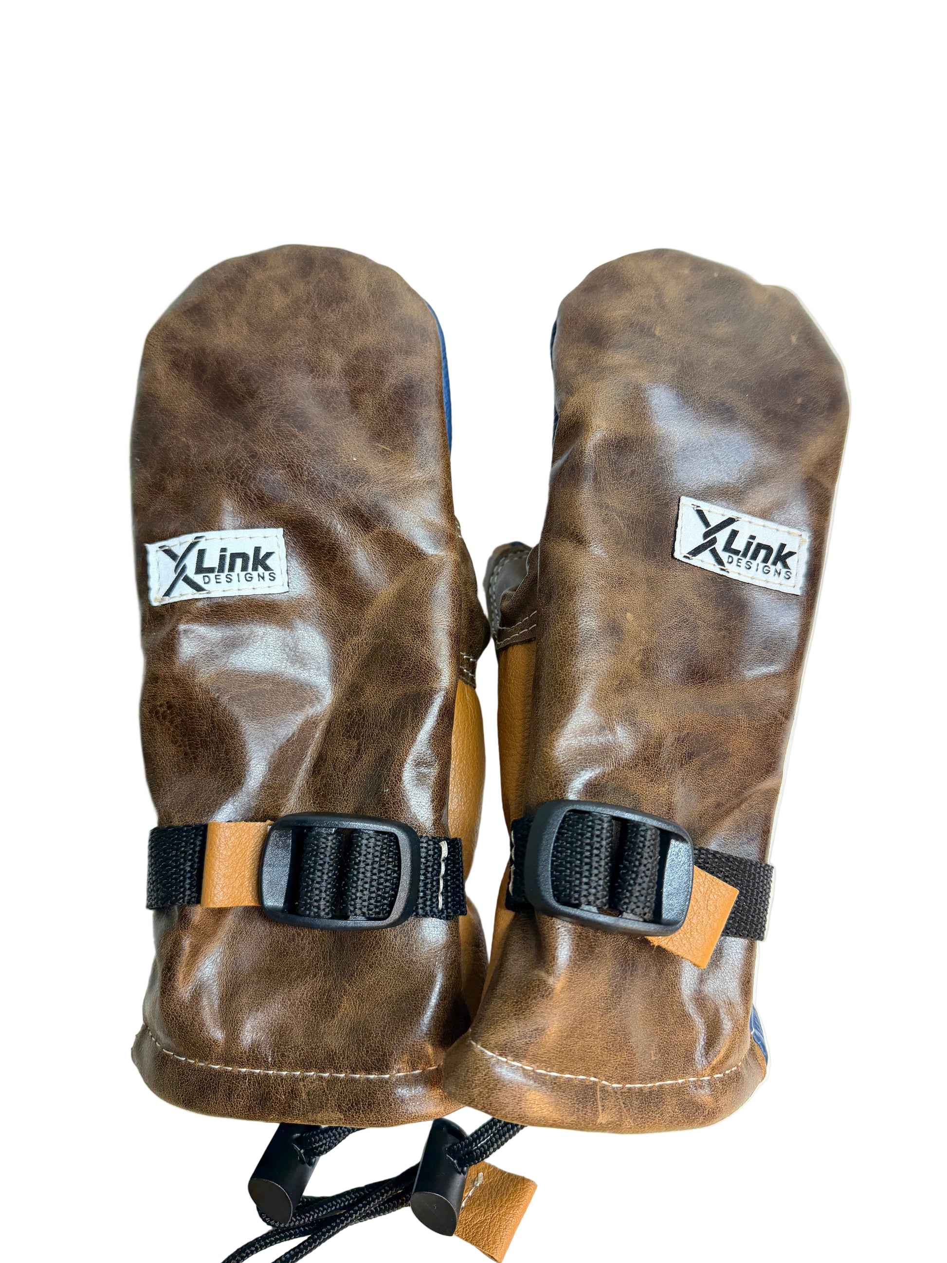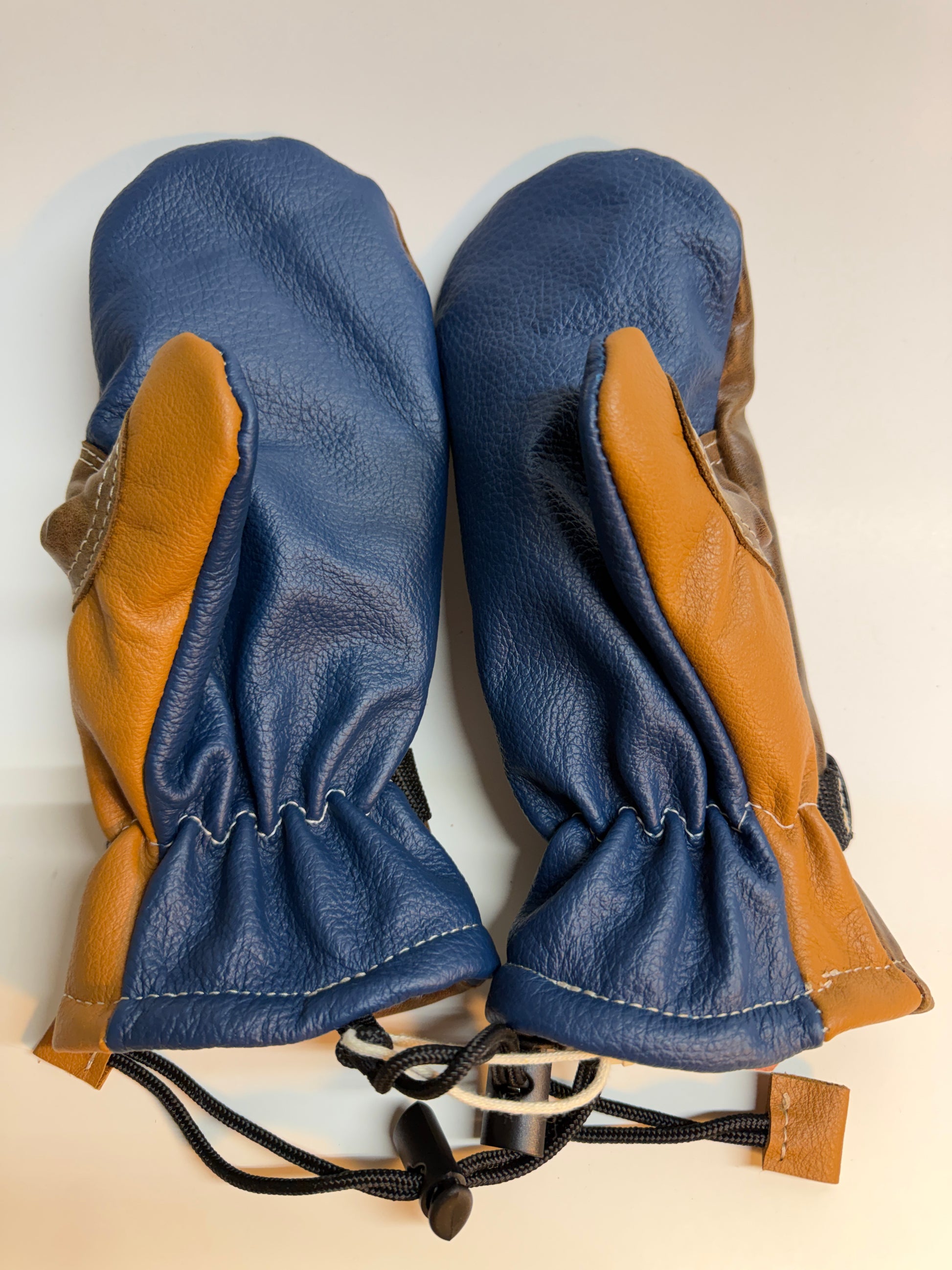 Mittens Made from upholstery leather scrap fabric. Blube leather palm with an elegant brown top and tan thumb. Extra durable, fleece lined to keep you warm and one of a kind! Size S